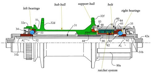 滾珠(珠檔)花鼓是由碗,軸檔和中間緊密排列的滾珠構(gòu)成的(中間留有細(xì)小的活動間隙),它們和花鼓體一起構(gòu)成一個(gè)大軸承,由于滾珠之間不需要像工業(yè)軸承那樣使用保持架,因此同樣尺寸的滾珠(珠檔)花鼓可以容納更多的滾珠,而且每顆滾珠的接觸面積較大,可以承受更大的壓力。