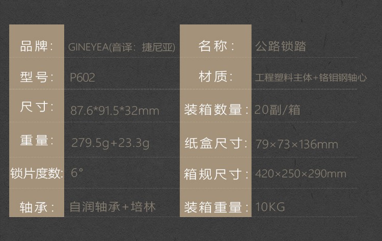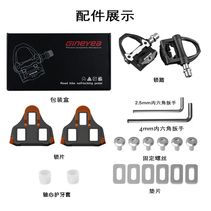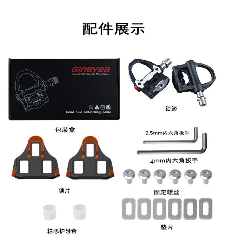 產(chǎn)品描述:品牌:GINEYEA(捷尼亞) 型號:P602 品號:13010426 品名:公路車鎖踏PRO(附鎖片6°)黑色執(zhí)行標(biāo)準(zhǔn):ISO4210 工藝:本體及扣片注塑成型材質(zhì):本體及扣片為工程塑料 軸心為鉻鉬鋼 顏色: 黑色/紅色/淺藍(lán)/橙色#公路車專業(yè)自鎖鎖踏,適用SPD-SL系統(tǒng),自帶鎖片體驗(yàn)不一樣的騎行速度、穩(wěn)定、省力,踏板流線型一體化設(shè)計,高強(qiáng)度質(zhì)量輕的尼龍材料加持,一對鎖踏僅重約278g,鎖片重量約88g,松緊度可調(diào)節(jié)的張力設(shè)置,靈...