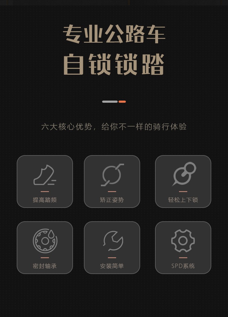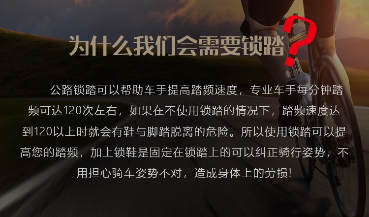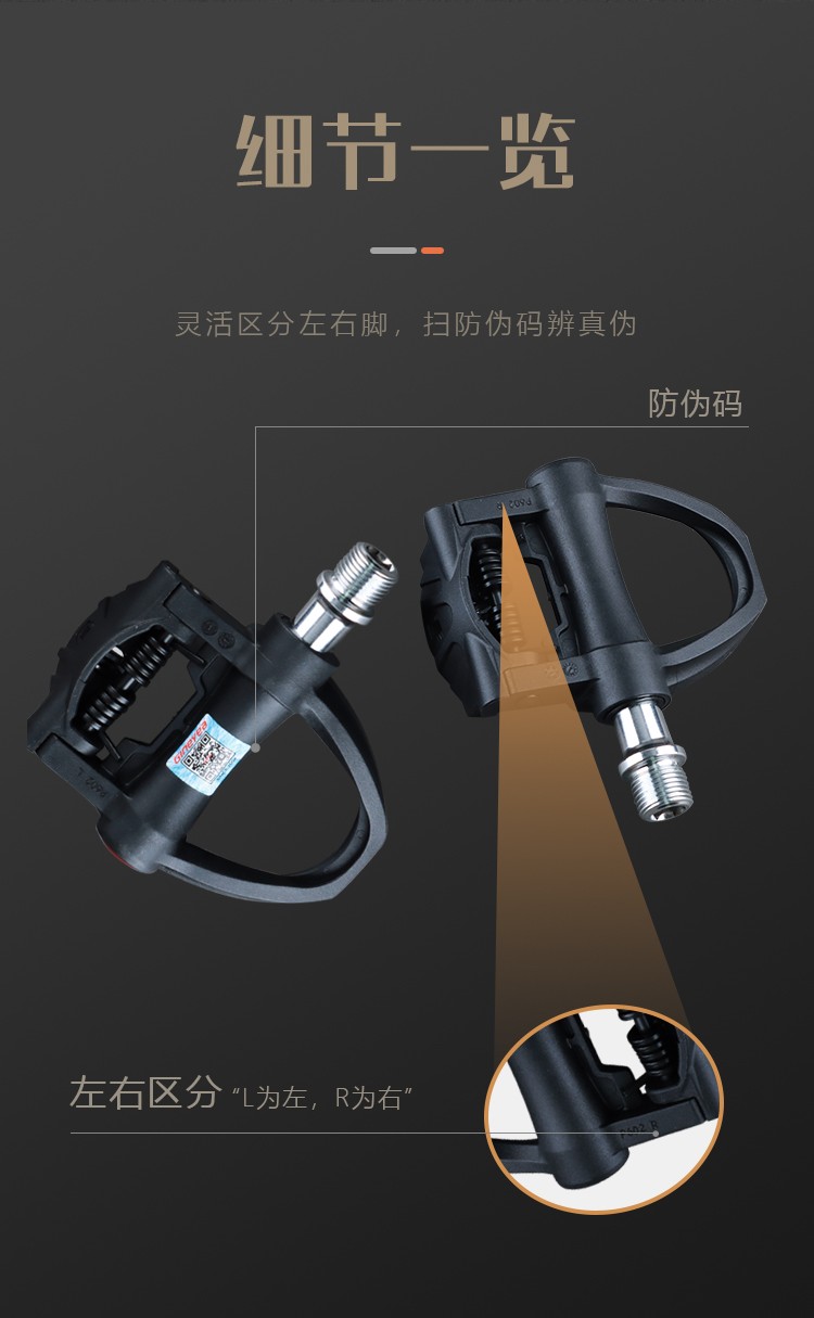 #公路車專業(yè)自鎖鎖踏,適用SPD-SL系統(tǒng),自帶鎖片體驗(yàn)不一樣的騎行速度、穩(wěn)定、省力,踏板流線型一體化設(shè)計,高強(qiáng)度質(zhì)量輕的尼龍材料加持,一對鎖踏僅重約278g,鎖片重量約88g,松緊度可調(diào)節(jié)的張力設(shè)置,靈活度更高,統(tǒng)一螺紋口徑14mm。
